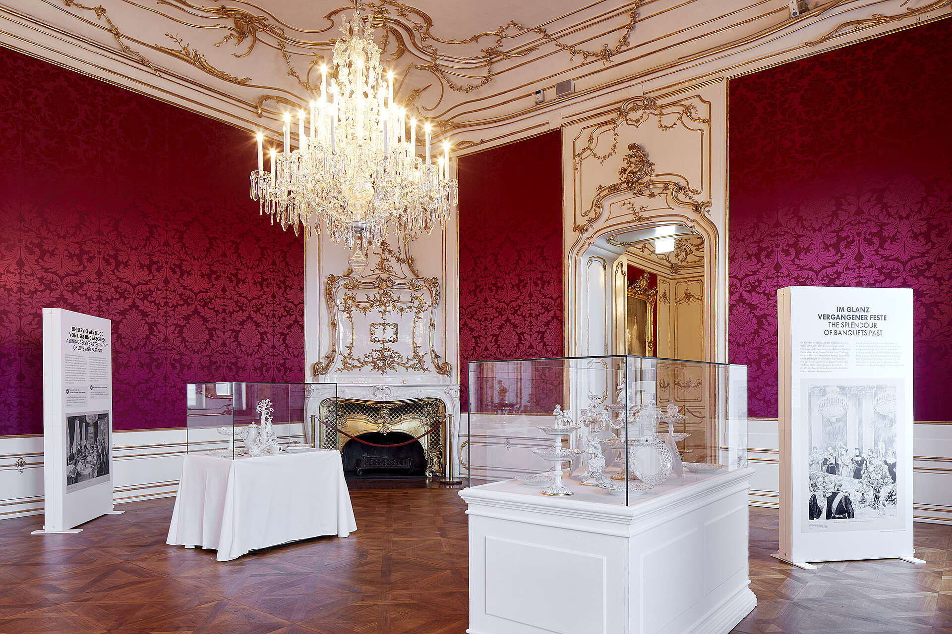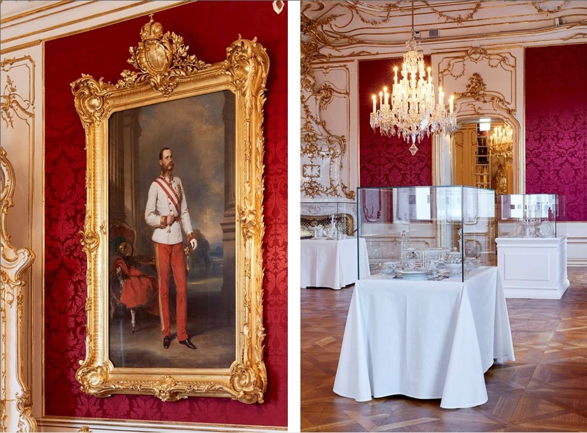 Die Restaurierungsarbeiten im Alexanderappartement sind abgeschlossen, und der Rundgang durch das Sisi Museum und die daran anschließenden Kaiserappartements ist ohne räumliche Einschränkungen möglich. Die ersten beiden Säle des Appartements gewähren einen kleinen Ausblick in die Zukunft, wenn hier das neue Sisi Museum entsteht: Statt barocker Tapisserien ziert neuerdings roter Hofdamast die Wände des Boucherzimmers und bietet den idealen Hintergrund für die berühmten Gemälde von Franz Xaver Winterhalter – das ganzfigurige Staatsporträt von Kaiser Franz Joseph in Galauniform und Kaiserin Elisabeth im Sternenkleid. Im anschließenden Speisesaal ist kostbares Tafelzeug aus dem Besitz der kaiserlichen Familie zu sehen. Darunter befinden sich Gedecke und prunkvolle Tafelaufsätze aus dem weiß-goldenen Speiseservice aus der Kaiservilla in Ischl sowie Silber und Porzellan, von dem Kaiserin Elisabeth im Archilleion auf der griechischen Insel Korfu speiste. Den Abschluss des Rundgangs bildet wieder ein Museumsshop, der zum Gustieren und entspannten Einkaufen einlädt.