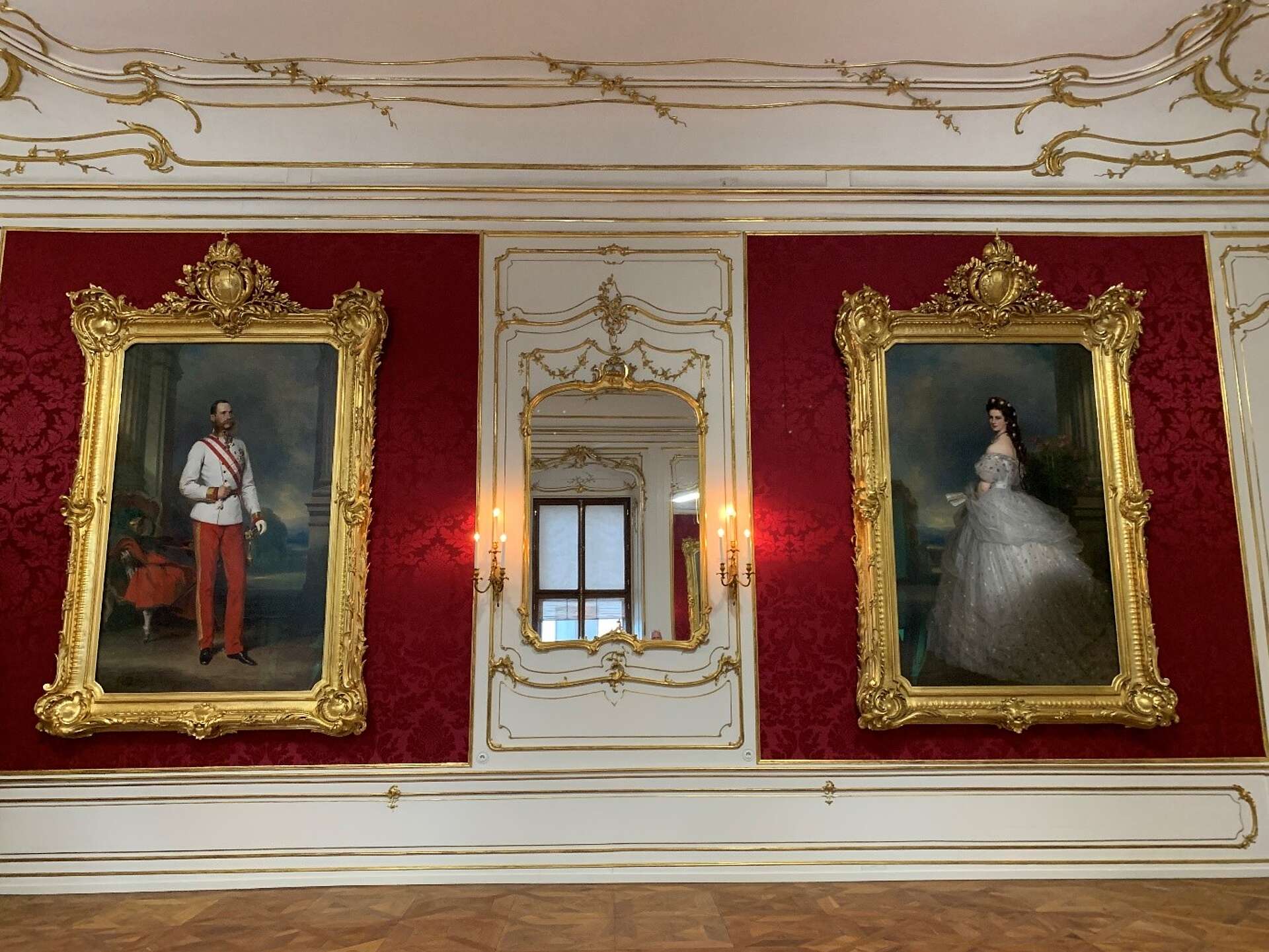 Im Zuge der umfassenden Neugestaltung des Sisi Museums wurden die beiden großformatigen Repräsentationsbilder, die Kaiser Franz Joseph und Kaiserin Elisabeth in eindrucksvoller Weise porträtieren, an ihren neuen Ausstellungsort im ehemaligen Boucherzimmer des Alexanderappartements überführt. Die Werke, geschaffen 1865 von Franz Xaver Winterhalter, zählen heute zu den bekanntesten und meistzitierten Darstellungen eines Herrscherpaars weltweit und gelten als Höhepunkt höfischer Porträtkunst des 19. Jahrhunderts. Ihre besondere Stellung wird durch die exklusive Präsentation im Raum unterstrichen: Ganz bewusst sind sie an einer mit rotem Hofdamast bespannten Wand angebracht, wodurch die historische Inszenierung aufgegriffen und die Wirkung der Gemälde intensiviert wird. So erleben die Besucher:innen die Porträts in einer Atmosphäre, die sowohl die kaiserliche Repräsentation als auch die intime Aura des Raums spürbar macht.
